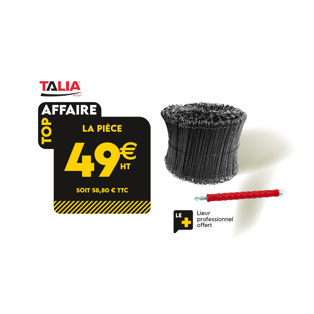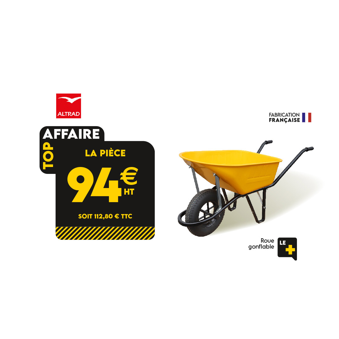 Une brouette, des disqueuses, 5 bottes de 1000 liens avec lieur pour fer à béton, une boîte de lingettes imprégnées, un seau en plastique renforcé